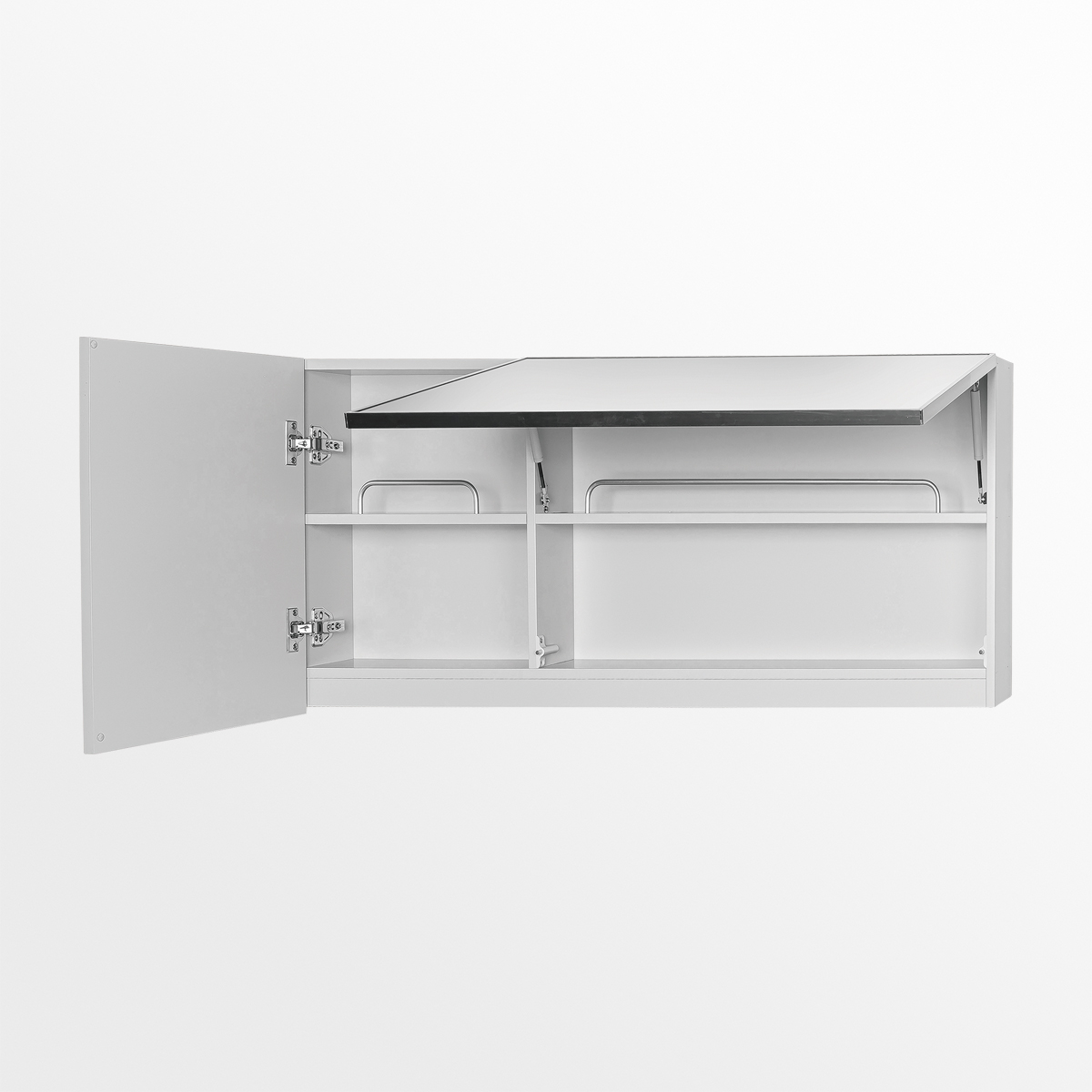 흑니켈 프레임, 유압 리프트 힌지 + 여닫이 댐핑 힌지 복합 적용, 실버 가이드